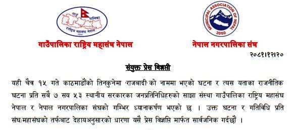 गाउँपालिका राष्ट्रिय महासंघका अध्यक्ष लक्ष्मिदेवी पाण्डे र नेपाल नगरपालिका संघका अध्यक्ष भीमप्रसाद ढुंगानाले संयुक्त रुपमा जारी गरेको प्रेस विज्ञप्तीमा उल्लेख छ ।