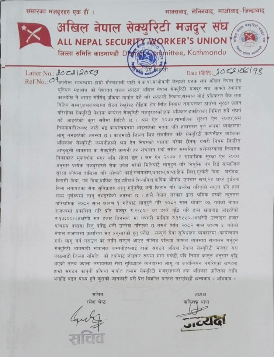 “हाम्रो संगठनले सेक्युरिटी श्रमिकको हकहित र अधिकारका निमित्त संघर्ष गर्दै आइरहेको विदितै छ,” विज्ञप्तिमा भनिएको छ, “श्रम ऐन २०७४, सामाजिक सुरक्षा ऐन २०७४, श्रम नियमावली २०७५ जारी भएता पनि हालसम्म व्यवहारतः कार्यान्वयन नभएकाले मजदुरहरुलाई सेवा प्रवेश गरेको मितिबाटै सेवा सुबिधाहरू प्रदान गर्न आग्रह गर्दछौं । अन्यथा, कानूनी प्रक्रिया मार्फत् अगाडि बढन बाध्य हुनेछौं ।”