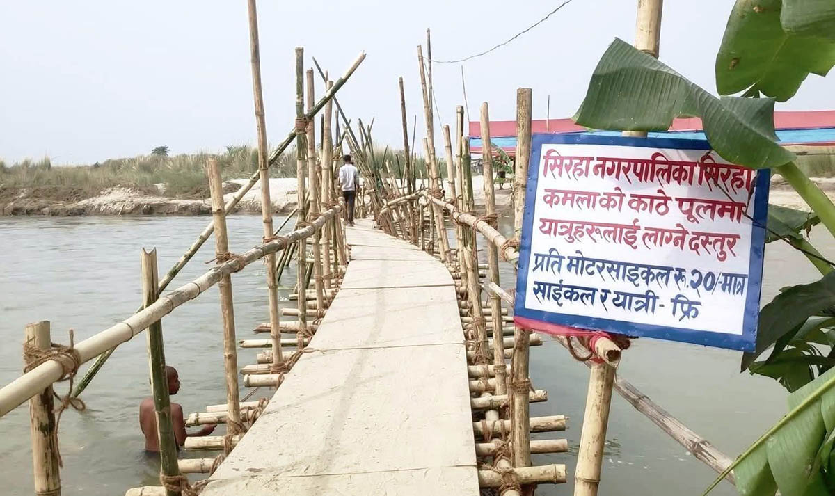 सिरहा, — हुलाकी राजमार्गअन्तर्गत सिरहा र धनुषालाई जोड्ने कमला नदीमा पुल निर्माण सुरु भएको १४ वर्ष बितिसक्दा पनि काम अलपत्र छ। निर्माण कार्य ठप्प भएपछि सिरहा–धनुषा आवतजावत गर्ने स्थानीय बासिन्दा अहिले पनि कामचलाउ काठेपुलको सहारा लिन बाध्य छन् ।